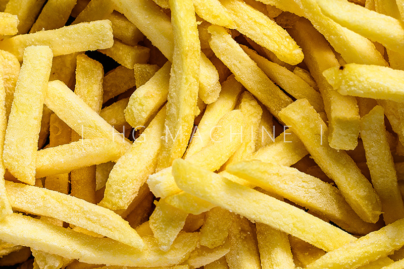 主要構成: 昇降コンベア、洗浄機、石取り機、計量ホッパー、皮むき機、集積供給ホッパー、ブラシ分離機、ベルト選別コンベア、予備蒸煮機、スライサー、長さ選別機、選別コンベア、ブランチング機、振動脱水機、乾燥機、連続フライヤー、振動油切り機、予冷機、急速冷凍機。