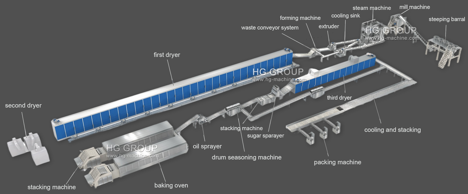 この全自動雪せんべい生産ラインには、日本と台湾の先進的な雪せんべい加工機械が組み込まれています。中核的な生産原則を維持しながら、中国の米品種の特有の特性と大規模生産の需要に合わせて最適化されています。生産ライン全体は、フライス加工、成形、パフ加工、調味料、包装の 4 つのセクションで構成されています。国内の経験豊富な米加工機器メーカーとして、この機器は効率的で安定した性能、高い生産能力、低い投資コストを備えており、雪米せんべい製品を開発する食品会社にとって最良の選択肢となっています。